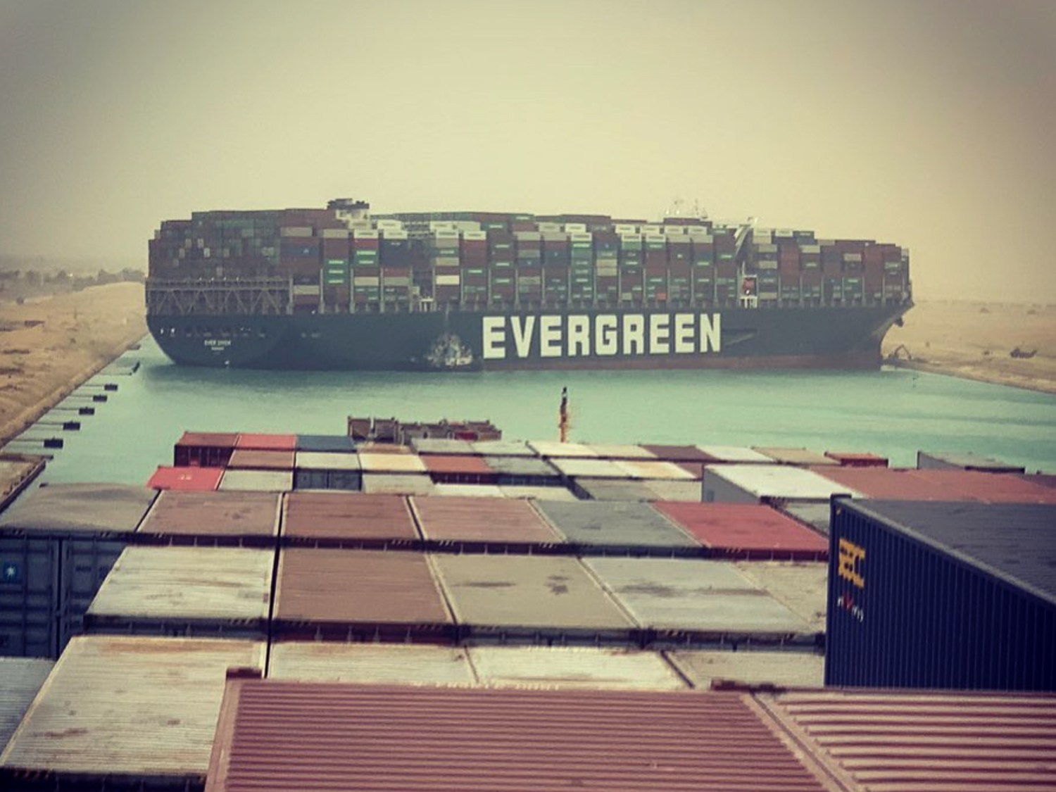 At 7:40 am on 23 March 2021, the 20k TEU container ship Evergreen Ever Given was navigating the Suez Canal when it ran aground, turning the ship sideways and blocking the canal, with the potential to impact oil and sea freight prices if she cannot be freed quickly by the tugs currently trying to assist.